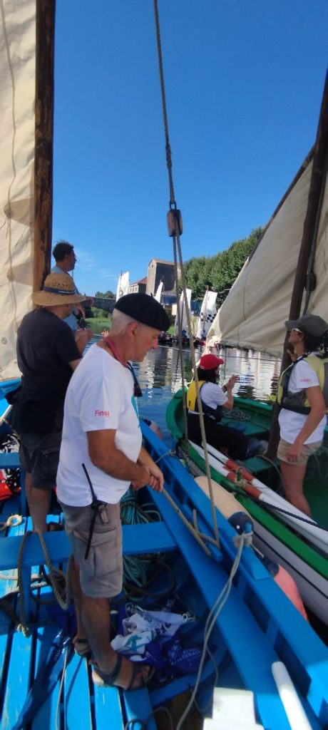 Si, dicimos con dificultades porque as embarcacións que viñamos de Rianxo tivemos que loitar contra un vento de proa (como non), esta vez nun espazo limitado para bolinar como é a canle do Ulla; en definitiva, que para chegar a tempo coa marea chea ao Espolón, tivemos que ser remolcados (grazas de novo aos nosos compañeiros que levan motor e ao apoio dado desde o concello de Rianxo).